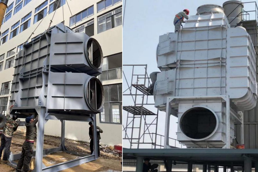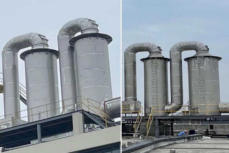在磷化工、石墨、有色冶煉等行業(yè),生產(chǎn)排放的飽和濕煙氣與低溫環(huán)境空氣接觸時(shí),在煙氣溫度下降過程中,煙氣中的水蒸氣過飽和凝結(jié),凝結(jié)水滴折射和散射光線,使煙羽呈白色或灰色,稱為濕煙羽。由于冬季溫度較低,相關(guān)問題的環(huán)保投訴較多。那么,有哪些種煙氣脫白技術(shù)?各種煙氣脫白的技術(shù)原理是怎樣的?1、冷凝相變煙氣脫白技術(shù)冷凝相變煙氣脫白原理為:煙氣經(jīng)濕法脫硫后,含濕量上升,為B狀態(tài),進(jìn)入換熱消霧模塊后。干態(tài)空氣A入換熱消霧模塊兩者交換后,A溫度上升,含濕量不變,相對(duì)濕度降低,處于C。B煙氣,溫度降低,相對(duì)濕度不變,含濕量降低,液滴析出,轉(zhuǎn)為D。D和受熱C流出換熱消零模塊,在氣室中混合,使D溫度下降,濕度降低:C溫度上升,相對(duì)濕度上升,兩種狀態(tài)的煙氣混合,最終達(dá)到F狀態(tài),AF連線始終處于不飽和狀態(tài),因此,不會(huì)出現(xiàn)可見白煙或霧氣團(tuán)。可以看出,冷凝混風(fēng)技術(shù)是煙氣脫白的較好技術(shù)路線,特別是在北方寒冷地區(qū),單純的煙氣再熱很難消除煙囪白煙。2、低電耗離子束煙氣脫白技術(shù)低電耗離子束煙氣脫白原理為:高速電子射流擊穿煙氣,產(chǎn)生正負(fù)離子體基團(tuán),煙氣中氣溶膠、飽和水滴、微小顆粒物在離子束的撞擊下,不斷發(fā)生凝聚效應(yīng),顆粒物和水滴快速凝聚成團(tuán),在重力作用下,落到離子束除變器底部流入脫硫塔或廢水收集池,達(dá)到降解顆粒物,氣溶膠和水零的目的。廢氣中的氨氧化物,由高速電子束提供能量,快速與氨氣發(fā)生還原反應(yīng),生成副產(chǎn)物水。低電耗離子束煙氣脫白優(yōu)點(diǎn):1.放電產(chǎn)生的離子體中,電子能量高,幾乎可以和所有的惡臭氣體分子作用。2.反應(yīng)快,不受氣速限制。采用防腐蝕材料。3.用電成本低,操作極為簡單,無需派專職人員看守,基本不占用人工費(fèi)。4.設(shè)備啟動(dòng)、停止十分迅速,隨用隨開,不受氣溫的影響。
